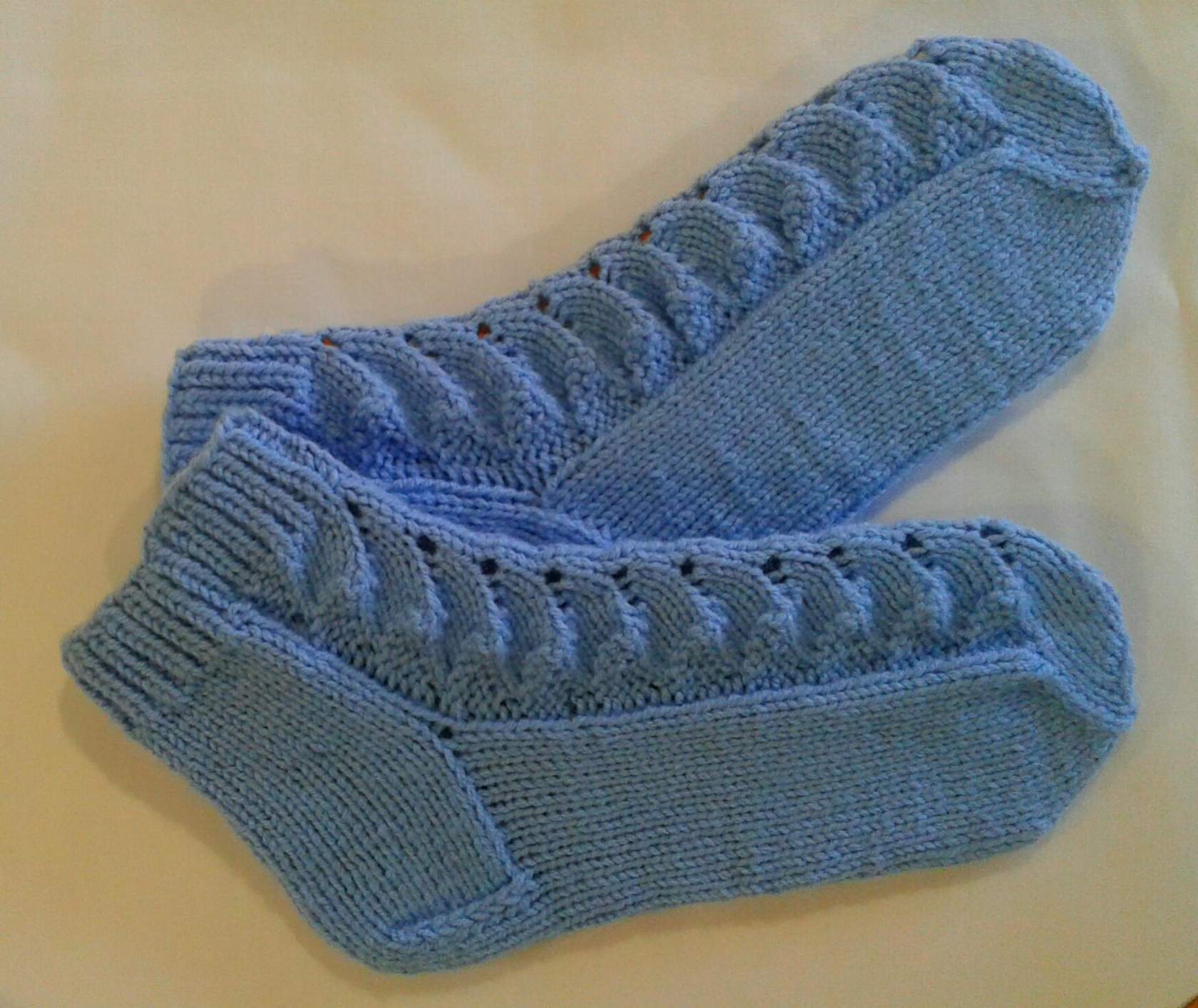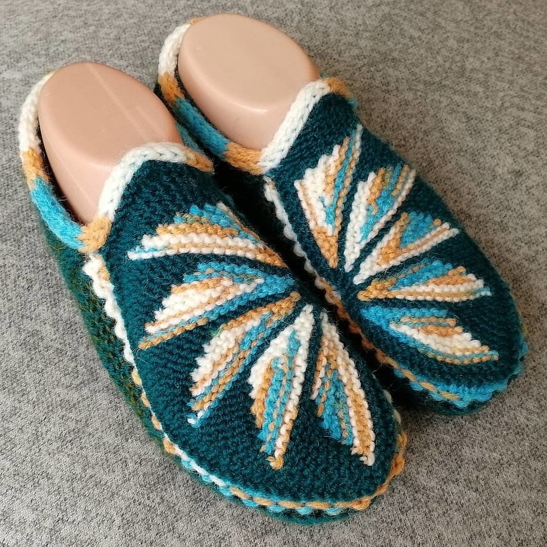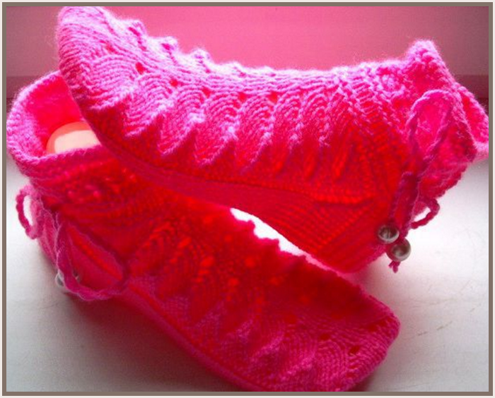 Следки спицамиKlubokhttp://klubok.work/1/53/8004/Klubokhttps://klubok.work/css/image/top-logo-en.pngКрасивые тапочки спицами , описание Набираем 48 петель, распределяем на 4 спицы и вяжем узор: 1 ряд – лицевыми петлями; 2 ряд — изнаночными петлями; 3 ряд – лицевыми петлями; 4ряд — изнаночными петлями; 5 и 6 ряды вяжем по кругу лицевыми петлями; 7 ряд – лицевыми петлями; 8 ряд — изнаночными петлями; 9 ряд – лицевыми петлями; 10 ряд — изнаночными петлями; 11 и 12 ряды вяжем по кругу лицевыми петлями; 13 ряд делаем дырочки для шнурков : *накид , 2 вместе лицевой за заднюю стенку* 14 ряд повторяем узор с 1 по 12 ряды Далее вяжем на 2-х спицах (24 петли) лицевые петли, а на двух (24 петли) — узор (это верх тапочка). Пятка: 24 петли делим на 3 части : 7 - 10 - 7 Вяжем только средние (7- 10 -7) 10 петель, делая, убавления в конце каждого ряда, провязывая по 2 петли вместе: с лицевой стороны – 2 вместе лицевой петлей, а с изнаночной – 2 вместе изнаночной петлей. Так вяжем, пока на спицах останется 10 петель; Затем поднимаем боковые петли и вяжем по кругу делая убавления, чтобы осталось на спицах по 12 петель Узор: 1 ряд – 6 изн., 6 лиц.; 6 лиц., 6 изн. 2 ряд – 5 изн., 2 вместе лиц. наклон вправо, 4 лиц., 1 накид, 1 лиц.; и в зеркальном изображении: 1 лиц., 1 накид, 4 лиц., 2 вместе лиц. наклон влево,5 изн. 3 ряд – 4 изн., 2 вместе, 4 лиц., накид, 2 лиц.; и в зеркальном изображении: 2 лиц., накид, 4 лиц., 2 вместе, 4 изн. 4 ряд – 3 изн., 2 вместе, 4 лиц., накид, 3 лиц.; и в зеркальном изображении: 3 лиц., накид, 4 лиц., 2 вместе, 3 изн. 5 ряд – 2 изн., 2 вместе, 4 лиц, накид, 4 лиц.; и в зеркальном изображении: 4 лиц., накид, 4 лиц., 2 вместе, 2 изн. 6 ряд — 1 изн, 2 вместе, 4 лиц., накид, 5 лиц.; и в зеркальном изображении: 5 лиц., накид, 4 лиц., 2 вместе, 1 изн. Далее повторяем узор до нужного вам размера. Вяжем как обычные носочки. Мысок: На 1 и 3 спицах убавление делаем в начале ряда (провязываем 2 петли вместе лицевой петлей); На 2 и 4 спицах убавление делаем в конце ряда (провязываем 2 петли вместе лицевой петлей); Но можно делать убавление петель в начале каждой спицы. Украшаем шнурком и бусинками
