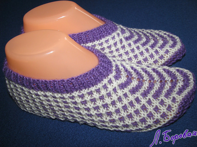 Тапочки спицамиKlubokhttp://klubok.work/1/53/8059/Klubokhttps://klubok.work/css/image/top-logo-en.pngОписание Л. Боровой Узор "цветные клетки" лёгкий и простой. 1 и 2 ряд - все петли лицевые. 3 - ряд - 1 лиц. петля, 1 петлю снимаем нить за работой и так до конца ряда.?? 4 - ряд - 1 лиц. петля, снятую петлю снимаем нить перед работой и так до конца рда. 5 - ряд - узор повторять с 1 -го ряда. Набрать нужное количество петель в зависимости от размера ноги и толщины пряжи. У меня 59 петель на 38 размер ноги. Количество петель должно быть нечетным. Провязываем 4 ряда резинкой или платочной вязкой. Отмечаем среднюю петлю, у меня это 30-я петля. На 29 петлях начинаем вязать узор. В каждом лицевом ряду из средней петли вывязываем 3 петли (1 лиц. , накид, 1 лиц.). Далее 29 петель узора в зеркальном отражении и так вяжем в каждом лицевом ряду, не забывая что в следующем лиц. ряду провязываем уже 30 пет, средняя опять добавка и так в каждом лицевом ряду на одну петлю больше, Так вязать нужную высоту следка. Подошва вяжется по принципу пятки.