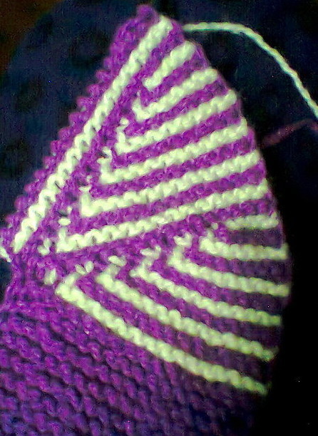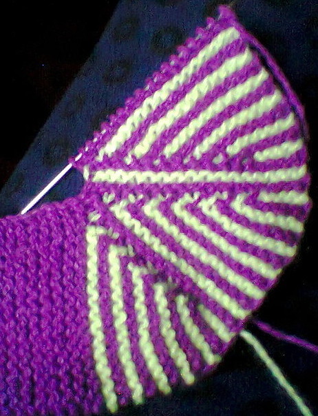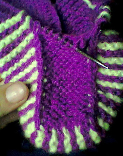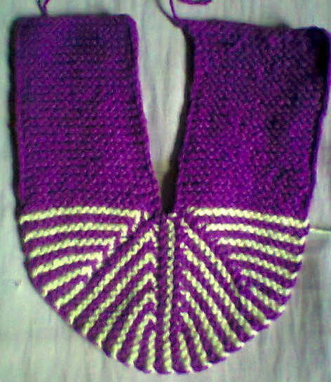Вяжем подошву на средних 10 петлях Когда связана верхняя часть тапочка, набираю по краю петли на три спицы. У меня где-то 120 петель. Провязываю 4ряда лицевыми. Затем делю петли на три части. 55-10-55 И вяжу средние 10 петель как пяточку у носка.