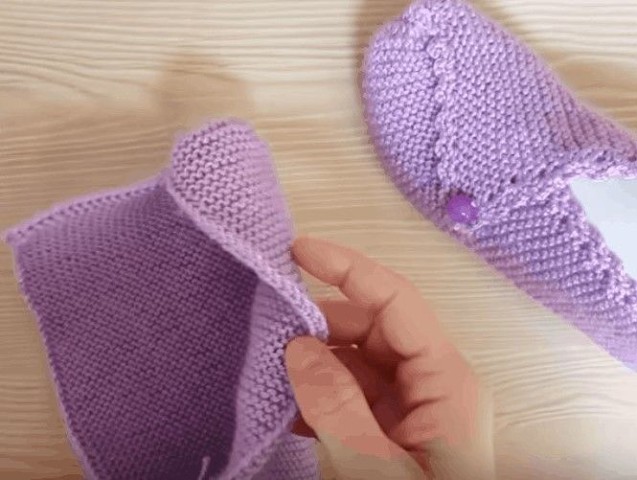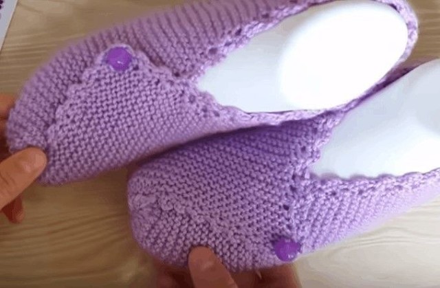 Сделать самостоятельно оригинальные тапочки — отличный способ научиться вязать. Все, что понадобиться: моток ниток, спицы, крючок и пара декоративных пуговиц. Невероятно, но заготовки под тапочки — всего лишь два прямоугольника, связанные исключительно лицевыми петлями. Опытной вязальщице на такую работу понадобится всего несколько часов, и это с учетом сборки! Особенности вязания и сборки тапочек Полотно, связанное платочной вязкой, довольно эластично и при этом не теряет свою форму. Для начала вяжем 2 прямоугольника, длина которых соответствует длине стопы без учета пальцев, а ширина приблизительно в 2,5 раза превышает ширину стопы. Начинаем сборку с формирования носка. Складываем прямоугольник втрое поперек вязания. Отступаем от края на треть. Это граница до которой полотно останется ровным. 2/3 части стягиваем нитью. Прикрепляем край к месту начала сборки. Переходим к формированию пятки. Выровняв полотно, складываем его пополам и сшиваем кетлевочным швом. Заворачиваем оставшийся конец и определяем место фиксации. Делать это можно прямо на ноге. Закрепив пуговицу, переходим к отделке. Крючком это сделать проще всего. Сборка второго тапочка проводиться аналогично, но в зеркальном отображении. Примеры элементарных схем для отделки:
