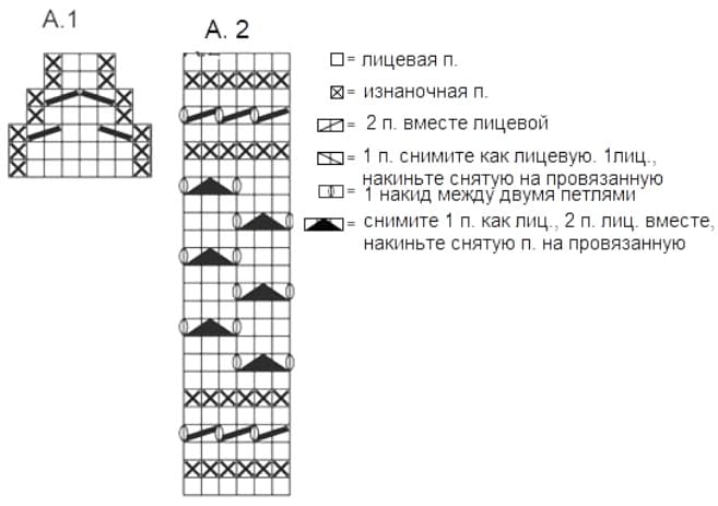Наберите 96/96/104 п. и вяжите первый узор ажурной резинки по схеме А 1 — один раппорт в высоту. В итоге на спицах станет 48/48/52 п.