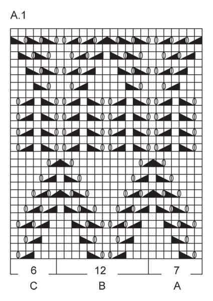 Cast on 39 sts (incl 1 edge st in each side) on circular needle size 6 mm with Snow. P 1 row (1st row = RS). K 1 row. Work next row as follows - from RS: 1 edge st in GARTER ST – see explanation above, A.1A (= 7 sts), A.1B (= 12 sts) over the next 24 sts, A.1C (= 6 sts), finish with 1 edge st in garter st. Work A.1 1 time vertically. REMEMBER THE KNITTING TENSION Then work 5 ridges - AT THE SAME TIME adjust no of sts to 37-39-41 sts on first row.