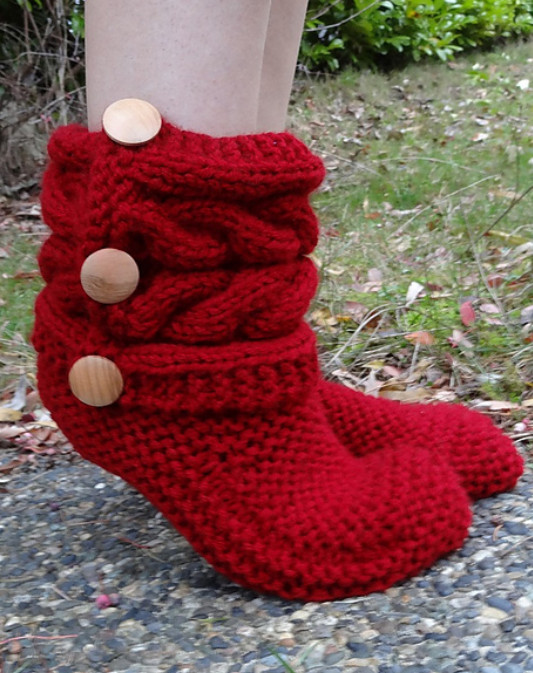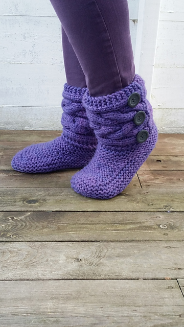 Cast on 22 sts on needle size 6 mm with Snow. Work 1 ridge in garter st, on last row inc 6 sts evenly = 28 sts. Work according to A.1 (= 28 sts) until piece measures approx. 32-33-35 cm, on last row dec 3 sts over every cable in A.1 = 22 sts. Work 1 ridge in garter st and cast off. Place cast-on edge over cast-off edge and sew on 3 buttons for decoration through the leg. Pull leg 2 cm down on foot with buttons on the outside of slipper and sew leg to cast-on edge on slipper from WS with invisible stitches.