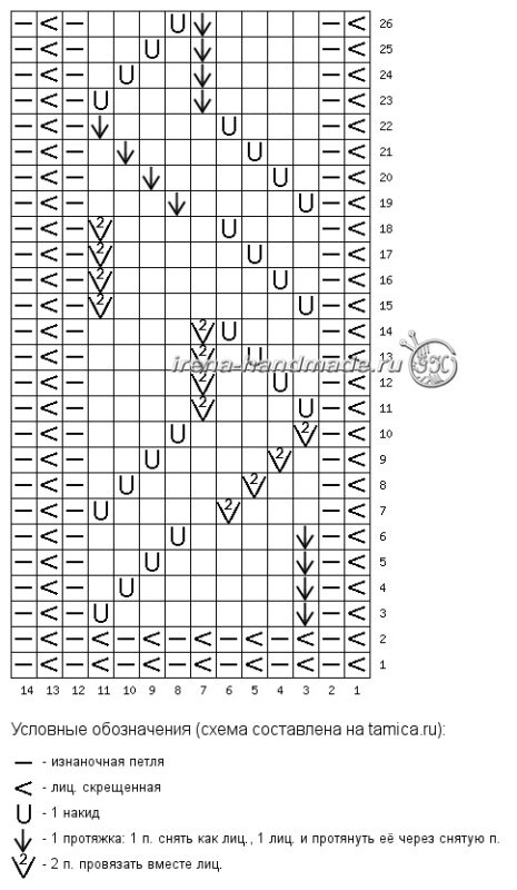 - 1 ряд. 13 лиц. с первой спицы. Вязание развернуть.
