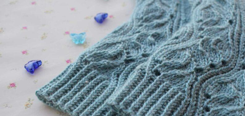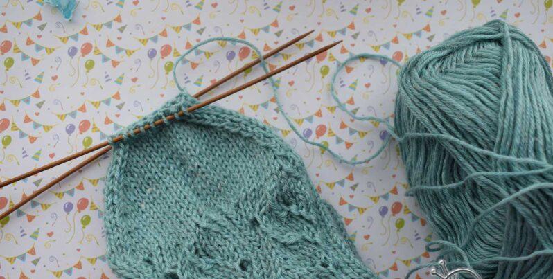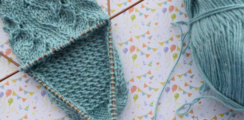 Как только на спицах останется 16 петель, распределить их следующим образом: 8 петель верхней панели ажурного носка поместите на одну спицу, а 8 нижней — на вторую. Далее их необходимо сшить трикотажным швом Китченера.