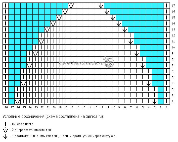 - 29 ряд (лицевой). 2 лиц, 2 петли провязать вместе лиц. с наклоном влево, 1 лиц., развернуть вязание.