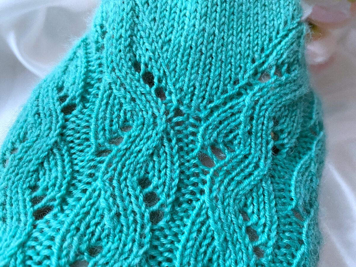 После того, как резинка связана, переходим к узору. Я связала 2 раппорта в высоту. Паголенок готов.