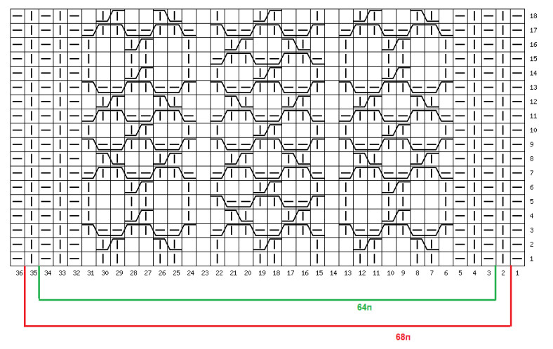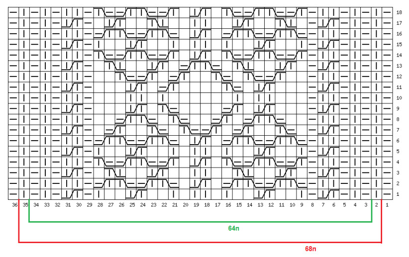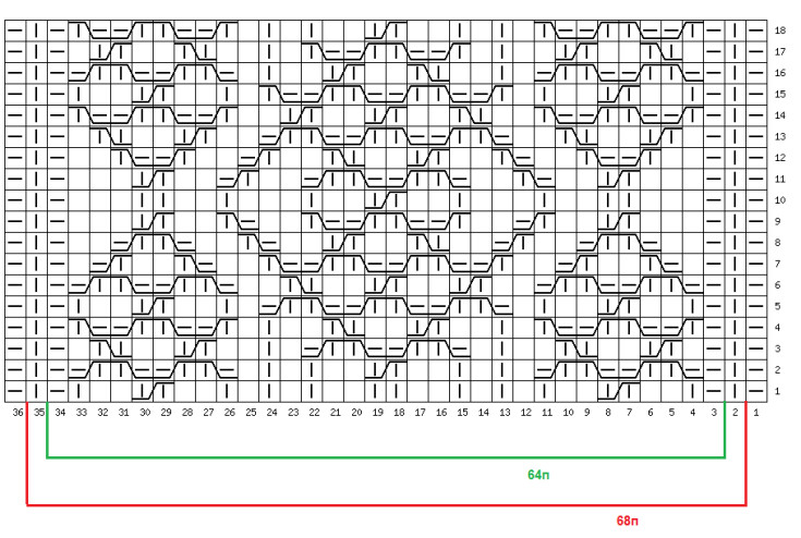 68 п: по схеме до последних 3х петель (лиц и изн), их вязать так: 1 лиц скрещ. (по схеме, эту петлю отметить маркером, вдоль нее будут прибавки), прибавка лиц с наклоном влево, 1 изн., 1 лиц скрещ.