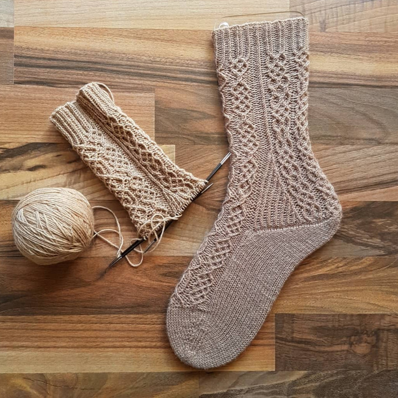 Теперь это новое начало ряда — середина стопы, араны располагаются на спицах 2 и 3, а нижняя часть носка — вяжем гладью, это спицы 1 и 4.