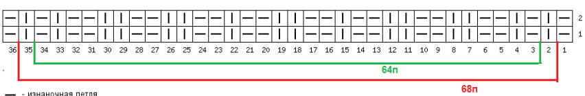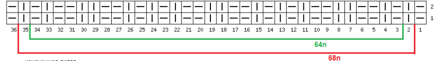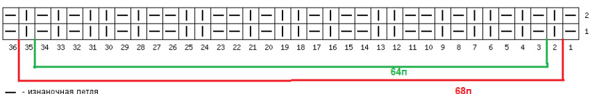 1 ряд: 32/34/36 лиц, 2 вместе лицевой, 1 лиц, повернуть работу на изнанку.