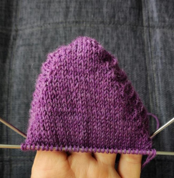 Продолжить делать прибавки через ряд вдоль отмеченных петель на спицах 3 и 4, чередуя прибавки лицевой и изнаночной, чтоб клин получился красивой резинкой.