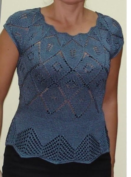 Роскошная кофточка LarimixKlubokhttp://klubok.work/1/82/7835/Klubokhttps://klubok.work/css/image/top-logo-en.pngЯ набирала петли, как описано: набрать 170 п.= 13 раппортов по 13 п. + 1 кром., но без кромочной (т.е. 169 п.), т.к. мне было легче сразу начать вязать по кругу. Поскольку у меня нить была тоньше, взяла более тонкие, чем рекомендовано, спицы. Горловина получилась небольшая, стяжка не понадобилась потом. Главное, чтобы голова пролезала. И примеряла на себя. Когда дошло до проймы (оставила раппорты для плеч), поняла, что мне нужно будет набирать дополнительные петли в проймах, иначе рука не пролезет (да и для меня самой места оставалось маловато ). Пройму делала в том же ряду, который указан в описании. Набрала на цепочках в.п. из бросовой нити по одному раппорту в проймах. Петли рукавов оставила открытыми (нанизала на очень толстую льняную нить, чтобы можно было примерять, надевая топик на себя в процессе работы). Впоследствие цепочки отплела и на открытых петлях проймы и рукавов связала по рисунку маленькие рукавчики — на несколько рядов. Т.к. спицы на леске, можно было все примерять в процессе вязания. Нитка была тонкая, поэтому рисунок ромбов повторила и далее вязала лицевой гладью перед каймой, сколько понравилось (пока не надоело, т.е. в 71-м ряду не стала делать ажур между треугольниками, а повязала гладью и только когда ширина гладьевой полосы меня устроила, стала провязывать среднюю часть рисунка, пока не получилась кайма, как на схеме. Можно было и кайму увеличить (даже не помню, делала я это или нет, по-моему, пару-тройку рядов добавила) — все зависит от желания и пропорций. Т.к. у меня тонкая нить, мне пришлось вязать гораздо больше рядов, чем указано в схеме, иначе мой топик закончился бы сразу под грудью Я так понимаю, что у вас тоже нитки тонкие, значит, придется также добавлять ряды и, возможно, раппорты подмышками (может, и не по одному — все зависит от толщины пряжи и вашего размера, но это не трудно рассчитать, главное, чтобы руки в отверстия пройм проходили и их можно было поднять и тулово проходило в остальной части топика ) При таком вязании всё зависит от примерки. Если Вы, отделив рукава и заколов их булавками, почувствуйте, что немного тесновато — добавьте при соединении между передом и спинкой несколько петель, набрав их на спицу рабочей нитью.