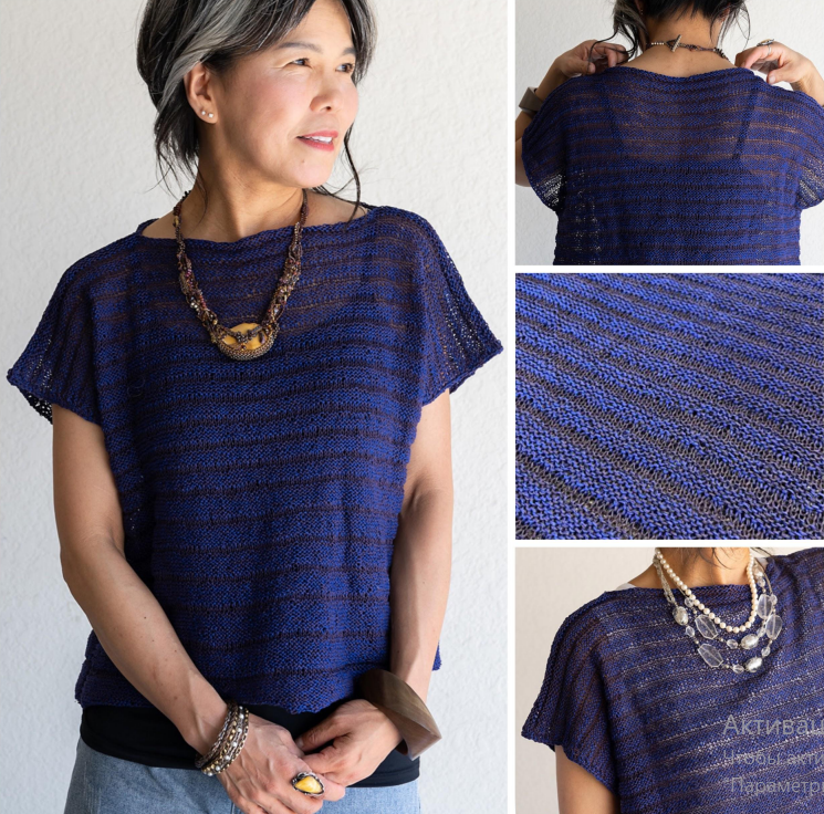 Текстурные узоры, используемые в проекте, формируют горизонтальные полосы, которые расправятся после блокировки. Из-за особенностей хлопковой пряжи в процессе носки топ еще немного вытянется в длину, а полосы станут более плоскими.