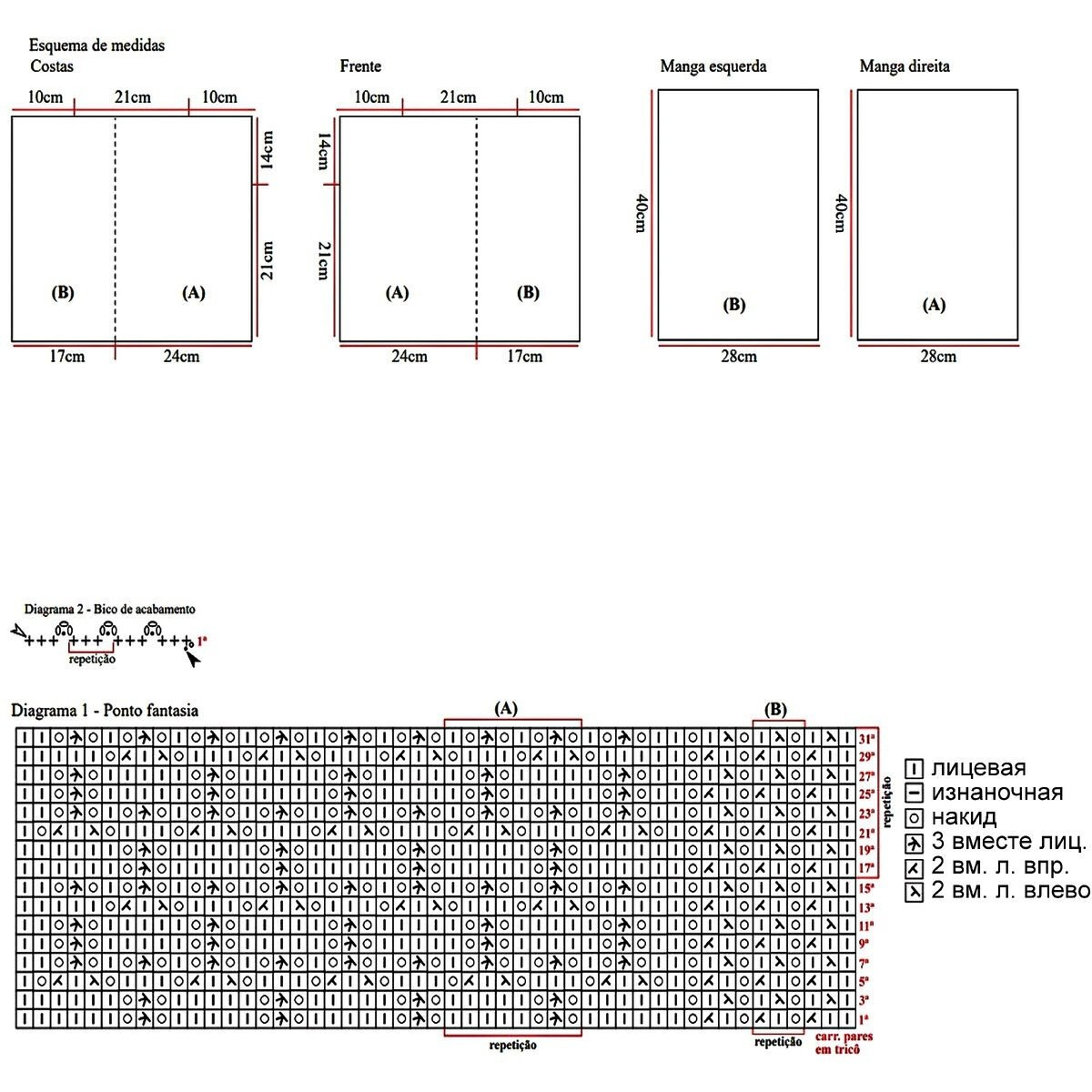 Точно так же, как и спинка, но узоры расположить так: 39 п. (узор A) и 28 п. (узор B).