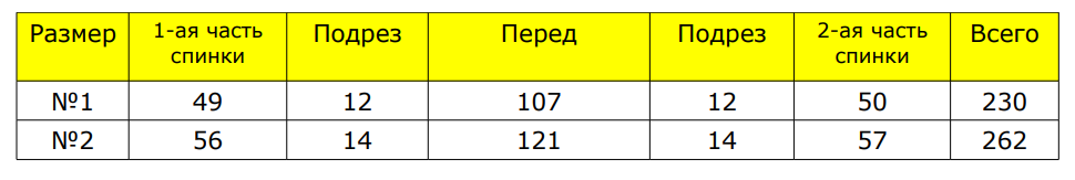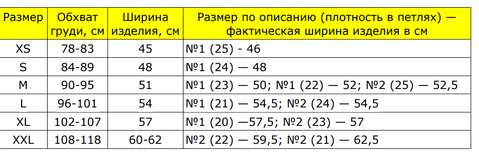 Размер Обхват груди, см Ширина изделия, см Размер по описанию (плотность в петлях) — фактическая ширина изделия в см XS 78-83 45 №1 (25) - 46 S 84-89 48 №1 (24) — 48 M 90-95 51 №1 (23) — 50; №1 (22) — 52; №2 (25) — 52,5 L 96-101 54 №1 (21) — 54,5; №2 (24) — 54,5 XL 102-107 57 №1 (20) —57,5; №2 (23) — 57 XXL 108-118 60-62 №2 (22) — 59,5; №2 (21) — 62,5 Т. е. у вас есть выбор, в какой плотности вязать изделие. Например, для размера L можно выбрать плотность 21п и вязать по описанию размера №1; в итоге ширина изделия будет 54,5см. Или же выбрать плотность 24п и вязать по описанию размера №2; в итоге ширина изделия тоже будет 54,5см. И также для других размеров, в таблице представлены все возможные варианты.