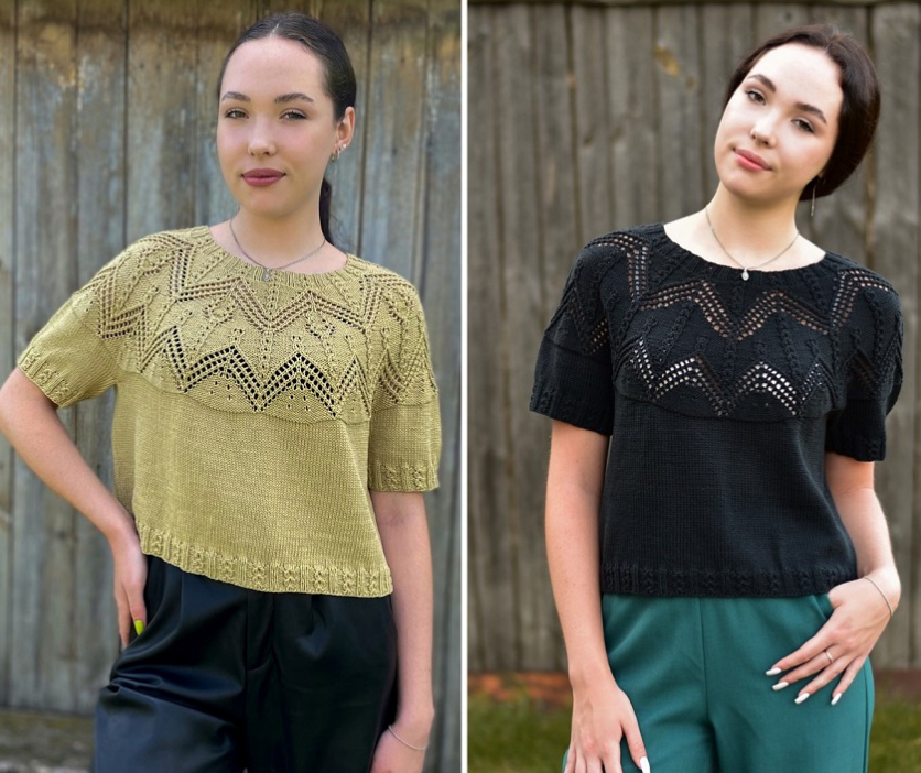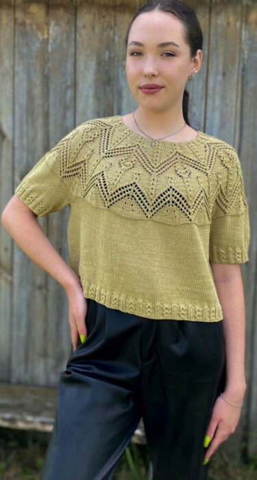 Конструкция и основные приемы – бесшовная модель; – прямой силуэт; – направление вязания — сверху вниз; – круглая кокетка; – ажурные узоры; – росток (и по спинке, и по переду) укороченными рядами; – подрезы.