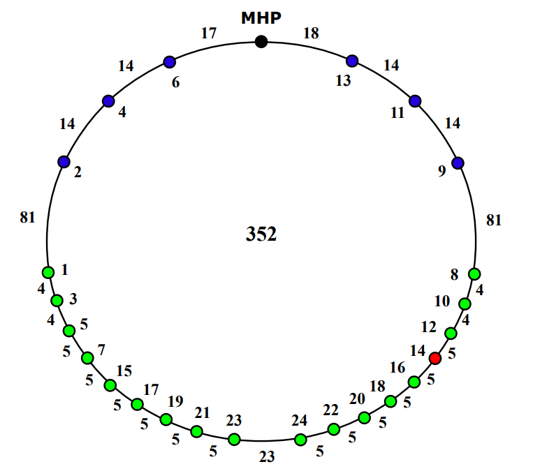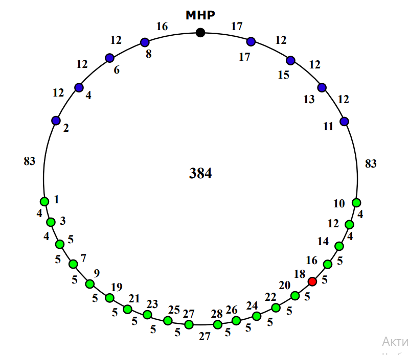 Как читать схему. По краю окружности внутри указаны точки разворота по порядку, снаружи — количество петель между ними, в центре — общее количество петель. Начинаем вязать от маркера начала ряда (по схеме движемся влево), т. е. провязываем (17+14+14+81)/(16+12+12+12+83) лицевых и оказываемся в 1-ой точке разворота. Поворачиваем вязание на изнаночную сторону. 1-ую петлю снимаем, как изнаночную, перетягиваем рабочую нить по направлению от себя до тех пор, пока на спице не образуется 2 петли (сдвоенная петля) , остальные петли вяжем изнаночными до второй точки разворота (80/82п). Поворачиваем вязание на лицевую сторону. 1-ую петлю снимаем, как лицевую, перетягиваем рабочую нить по направлению к себе до тех пор, пока на спице не образуется 2 петли (сдвоенная петля) , остальные петли вяжем лицевыми до третьей точки разворота. И так далее. !Сдвоенные петли провязываем по лицевой стороне - лицевой , по изнаночной стороне - изнаночной за заднюю стенку.