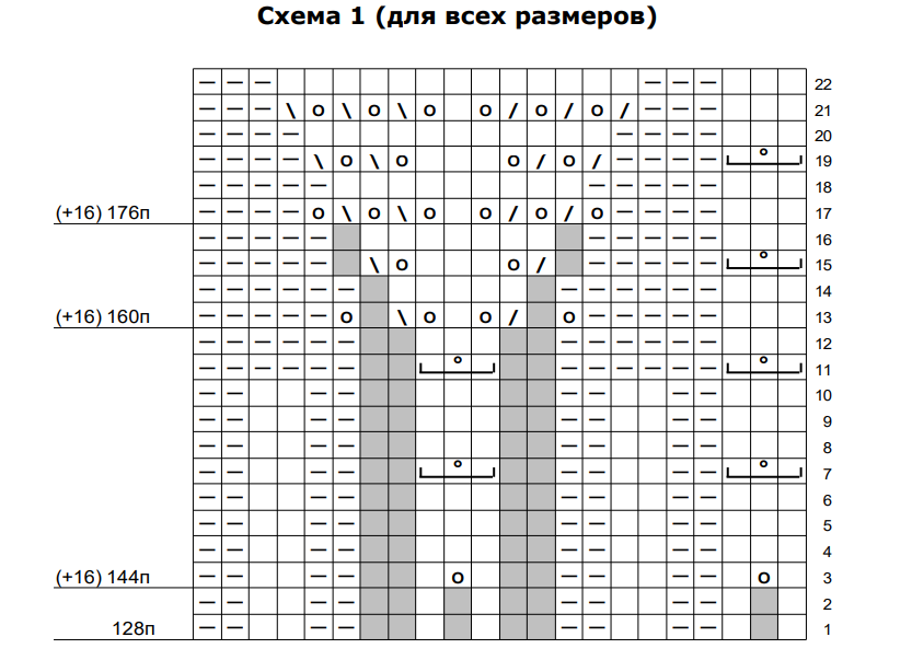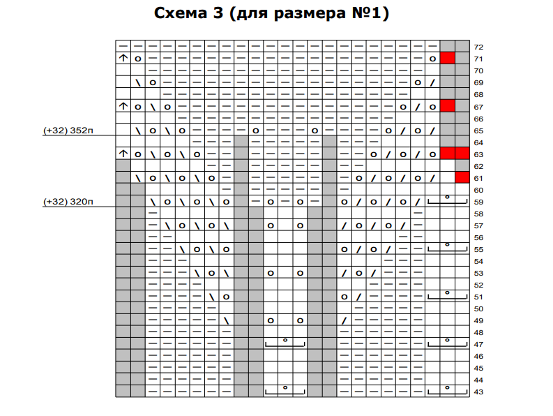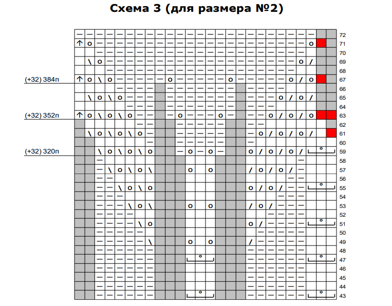 61,63,67,71 ряды. Убрать МНР, провязать столько петель, сколько отмечено красным, лицевыми; поставить МНР, и далее считать это место началом ряда. После того как провязали все ряды схемы, на спицах должно быть 352/384п.