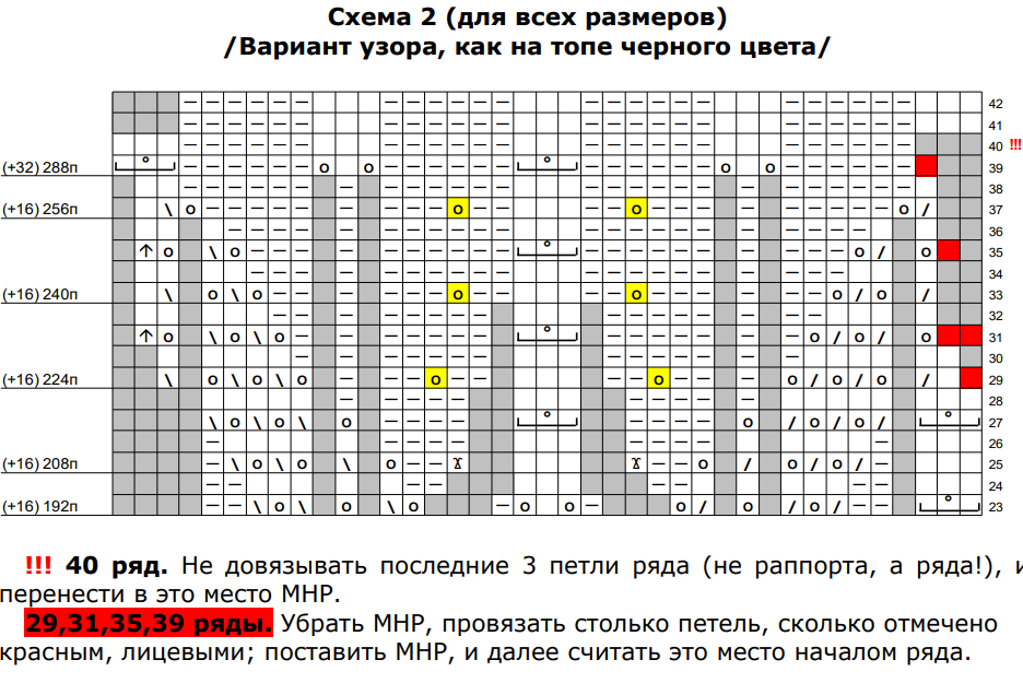 !!! 40 ряд. Не довязывать последние 3 петли ряда (не раппорта, а ряда!), и перенести в это место МНР. 29,31,35,39 ряды. Убрать МНР, провязать столько петель, сколько отмечено красным, лицевыми; поставить МНР и далее считать это место началом ряда.