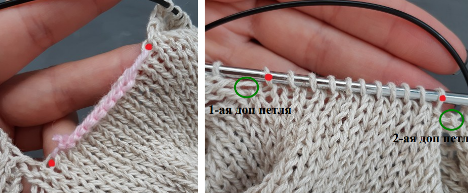 Распустить дополнительную нить и собрать все петли на спицы. ! В районе подреза должно получиться на 1 петлю больше, чем набиралось изначально, т.е 13/15п (первая и последняя петли отмечены на фото красным).
