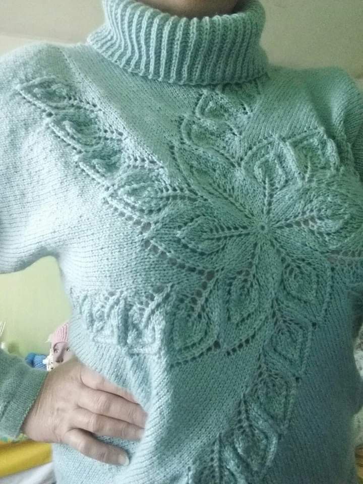 Для плечевых вставок набрать на спицы №3,5 по 50 петель с каждой стороны и вязать по схеме В 22р. Соединить со спинкой.