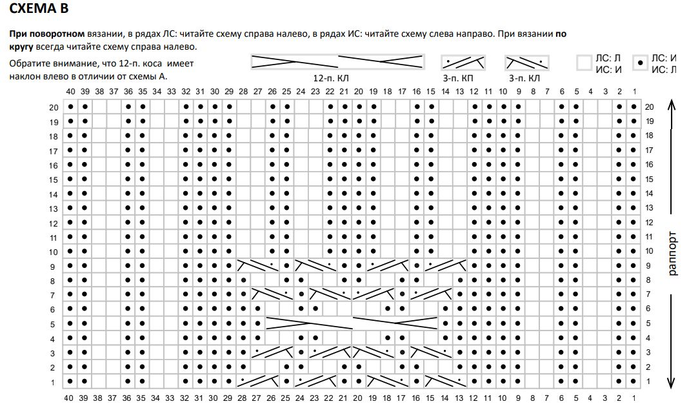 При поворотном вязании: В рядах ЛС читайте схему справа налево. В рядах ИС читайте схему слева направо.
