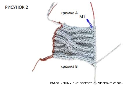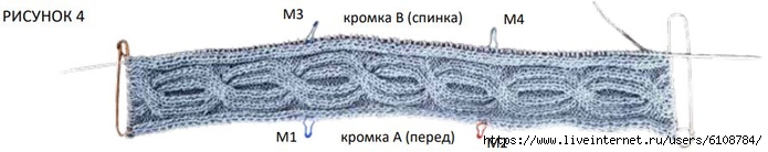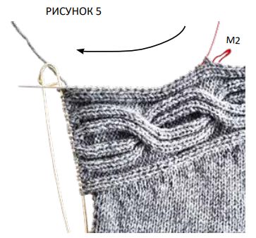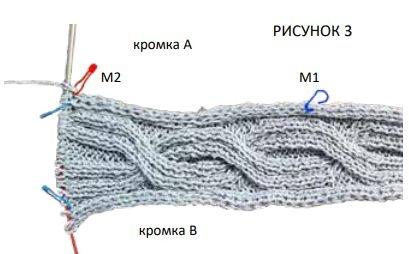 Спицами меньшего размера, новой рабочей нитью с ЛС равномерно поднимите 35 (35/ 35/ 36/ 36) (39/ 39/ 41/ 41) п. (примерно 5 п. из каждых 7 рядов) вдоль кромки А полосы с косой, начиная с М2, заканчивая у держателя петель (см. рисунок 5). Удалите М2.