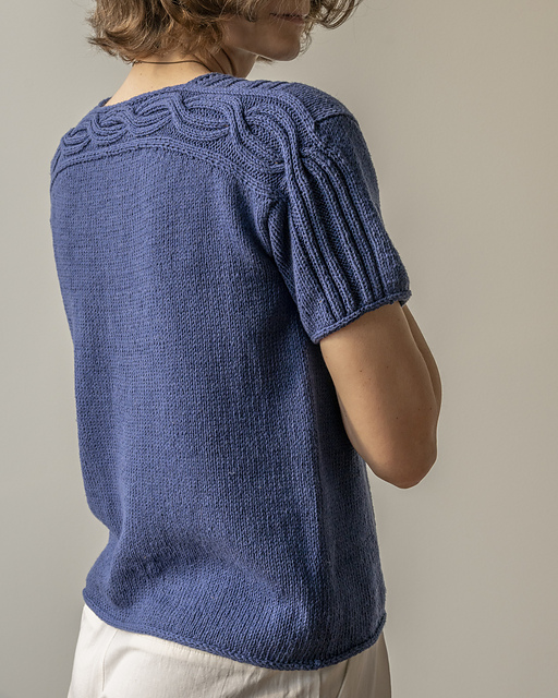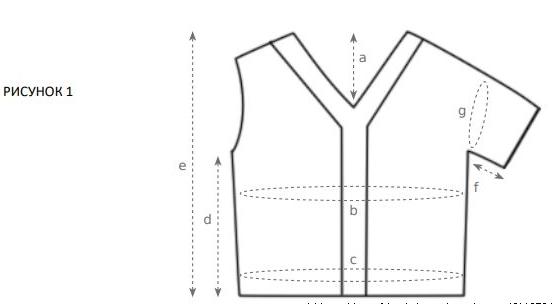 Футболка вяжется сверху вниз и имеет модифицированную конструкцию спущенного плеча и так называемый европейский плечевой шов, который отходит от естественной линии плеча.