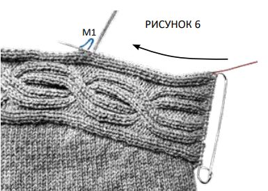 Спицами меньшего размера, новой рабочей нитью с ЛС равномерно поднимите 35 (35/ 35/ 36/ 36) (39/ 39/ 41/ 41) п. (примерно 5 п. из каждых 7 рядов) вдоль кромки А полосы с косой, начиная от держателя петель, заканчивая у М1 (см. рисунок 6). Удалите М1.