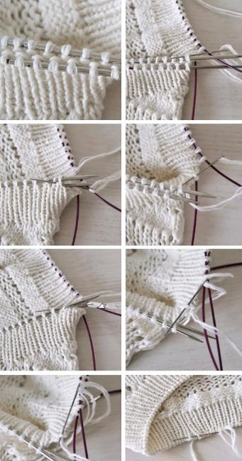 б) Не перепутать снятую со спицы прошиваемую петлю с петлей, которая находится в предпоследнем круге. На шестой фотографии поднятая петля находится одним рядом ниже той петли, которую в действительности нужно прошить. Нужная петля находится выше (см. седьмую фотографию). Если зацепить иглой неправильную петлю, край в итоге будет зубчатый и неровный.