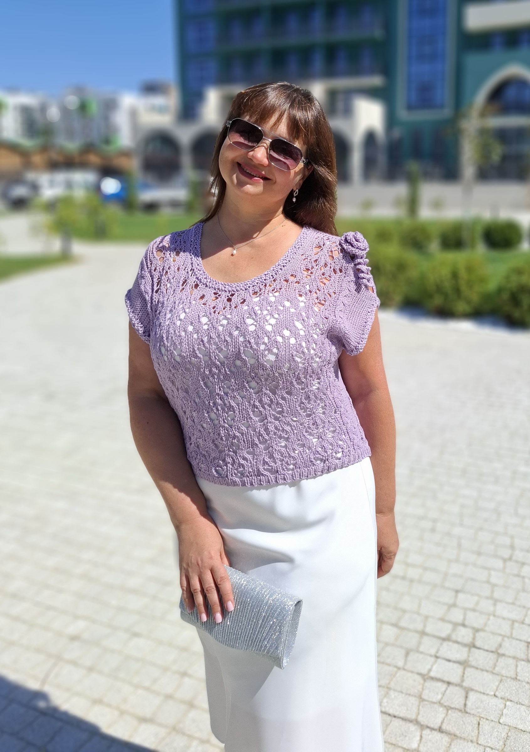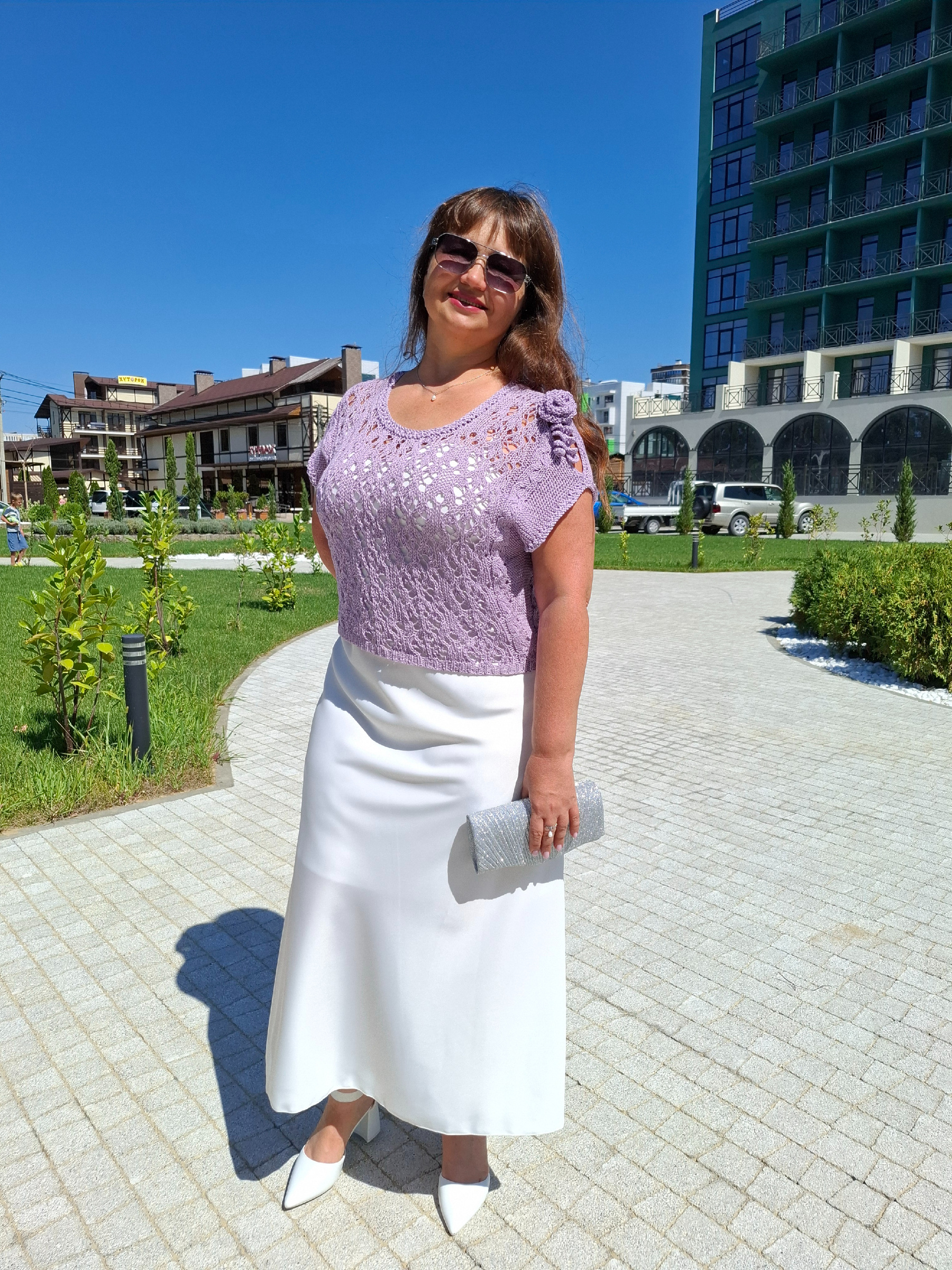 Сшить все петли правого плеча с помощью крючка по открытым петлям. У левого плеча сшить только первые от выреза горловины 15 п. Оставшиеся петли закрыть по лицевой стороне, соединив между собой только самые последние петли. Таким образом, у левого плеча формируется разрез.