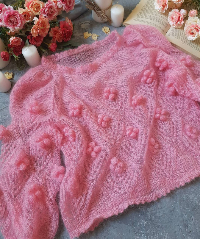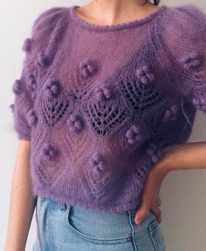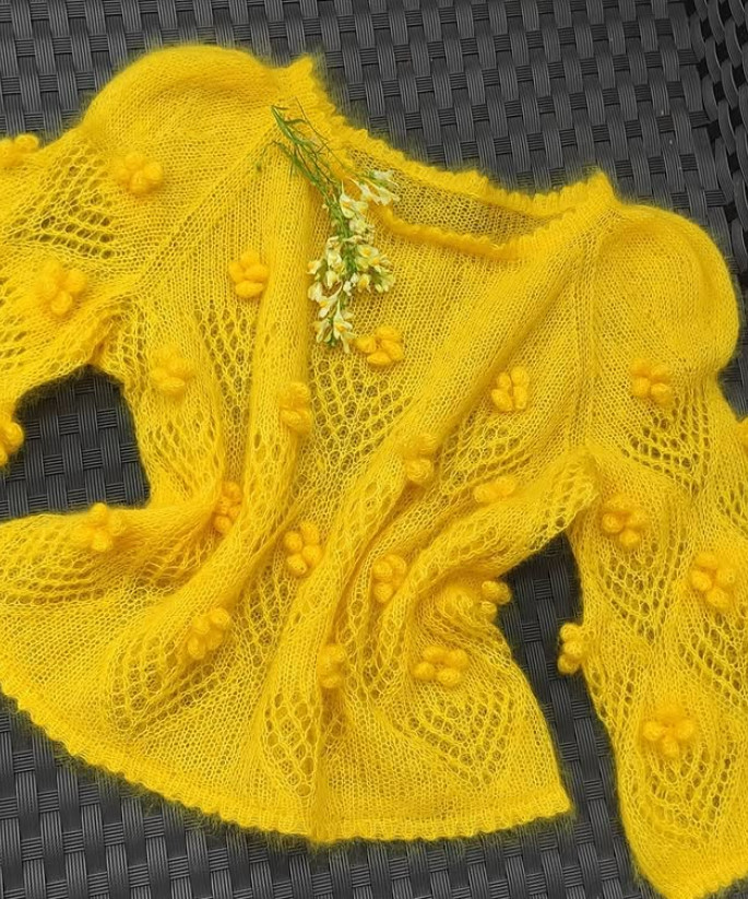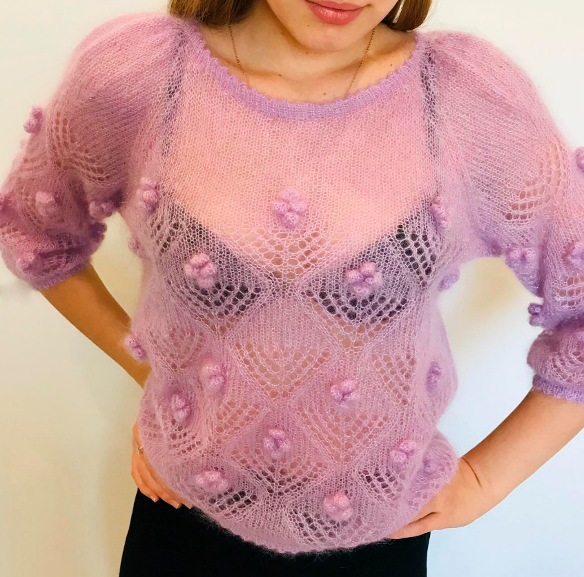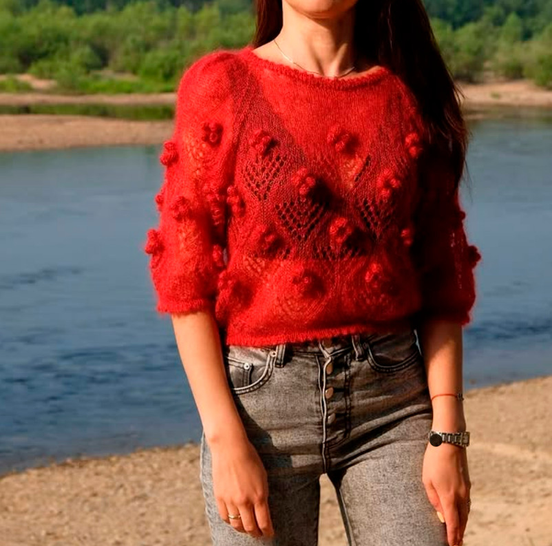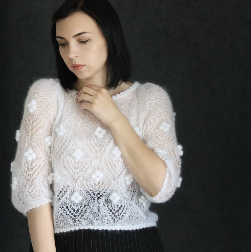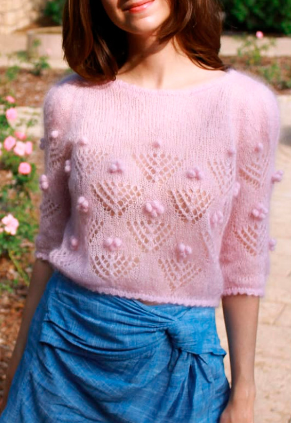 Блузка вяжется снизу вверх в одну нить. Тело и рукава вяжутся отдельно по кругу до пройм, затем соединяются в кокетку и вяжутся вместе.