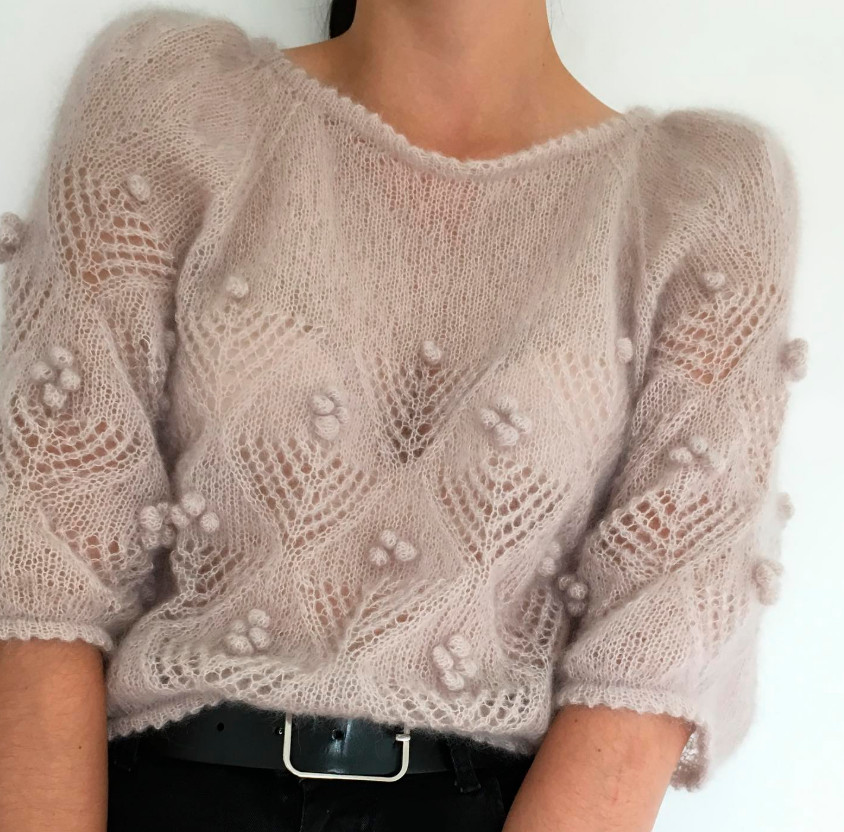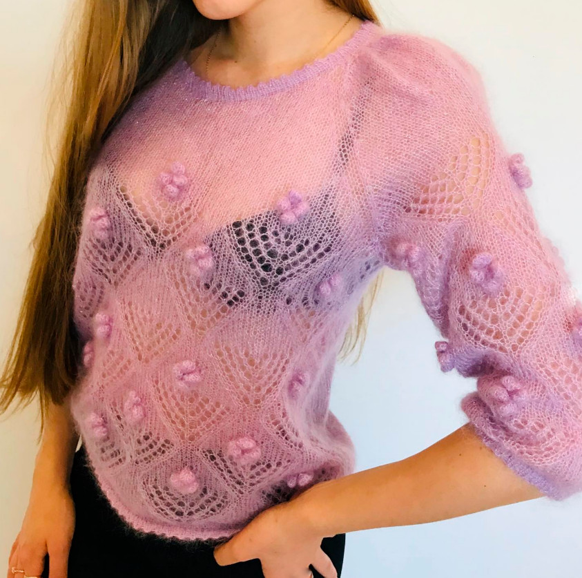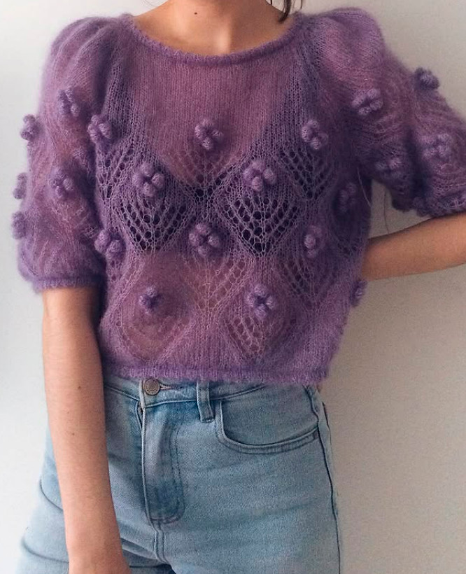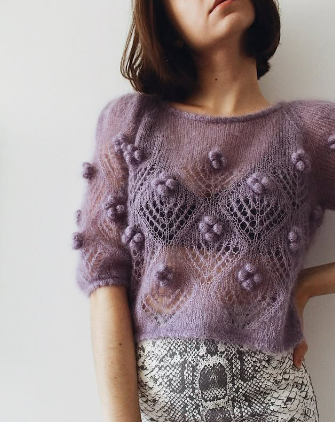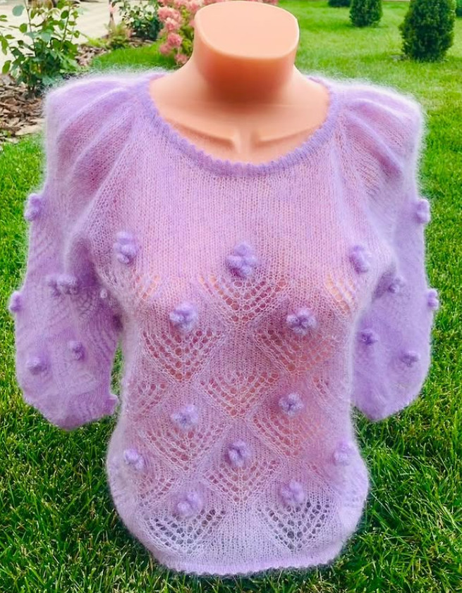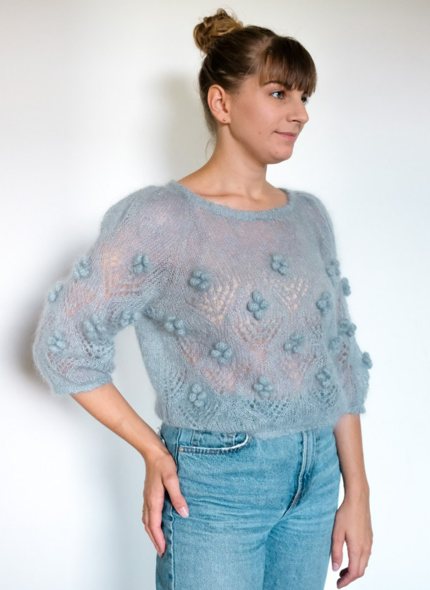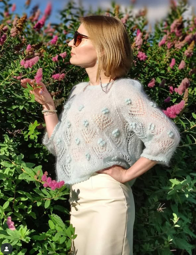 Блузка вяжется снизу вверх в одну нить. Тело и рукава вяжутся отдельно по кругу до пройм, затем соединяются в кокетку и вяжутся вместе.