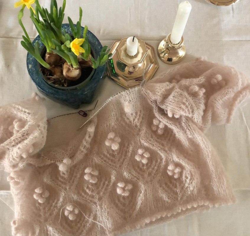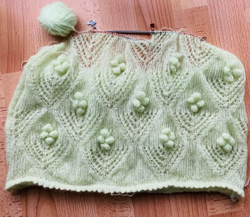 На фотографии показано изделие после выполнения последнего ряда с прибавками в рукавах.