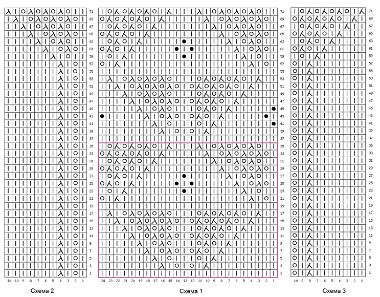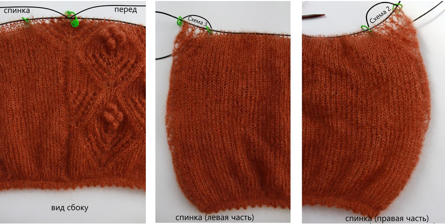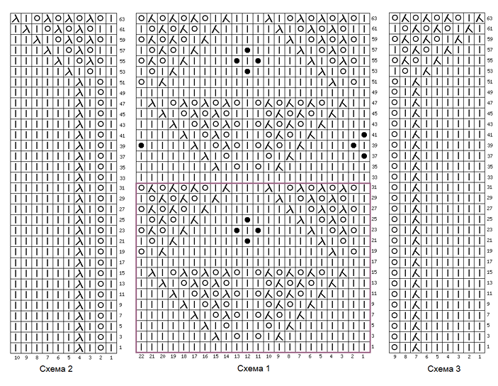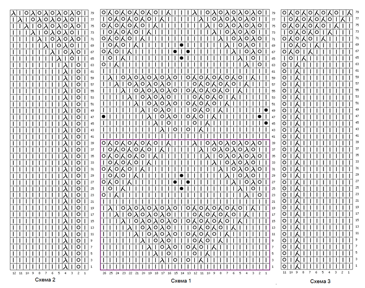 Узор на петлях спинки, вяжущихся по Схемам 2 и 3, вяжите так же, как это указано в соответствующих рядах Схем 2 и 3.
