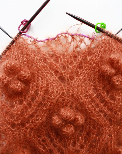 Перенесите петли наборного края на другую пару спиц того же размера, удалите вспомогательную нить.