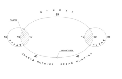 Основной узор вяжется только на петлях переда, дополнительный узор вяжется частично на петлях спинки, которые в будущем сформируют подрезы.