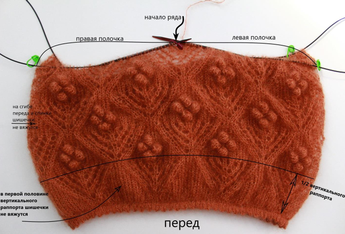(Под фотографией видны подписи: «правая полочка», «начало ряда», «левая полочка», «спинка», «перед», «в первой половине вертикального раппорта шишечка не вяжется», «на стыке переда и спинки узор из шишечек не вяжется».)