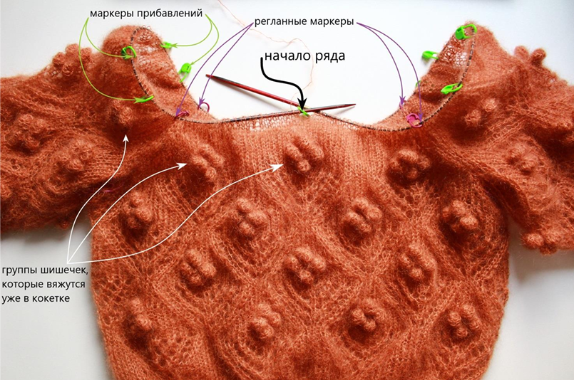 Количество рядов после соединения в кокетку и прибавок в рукаве может отличаться от того, что у вас на спицах.