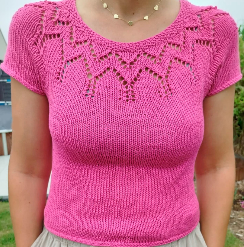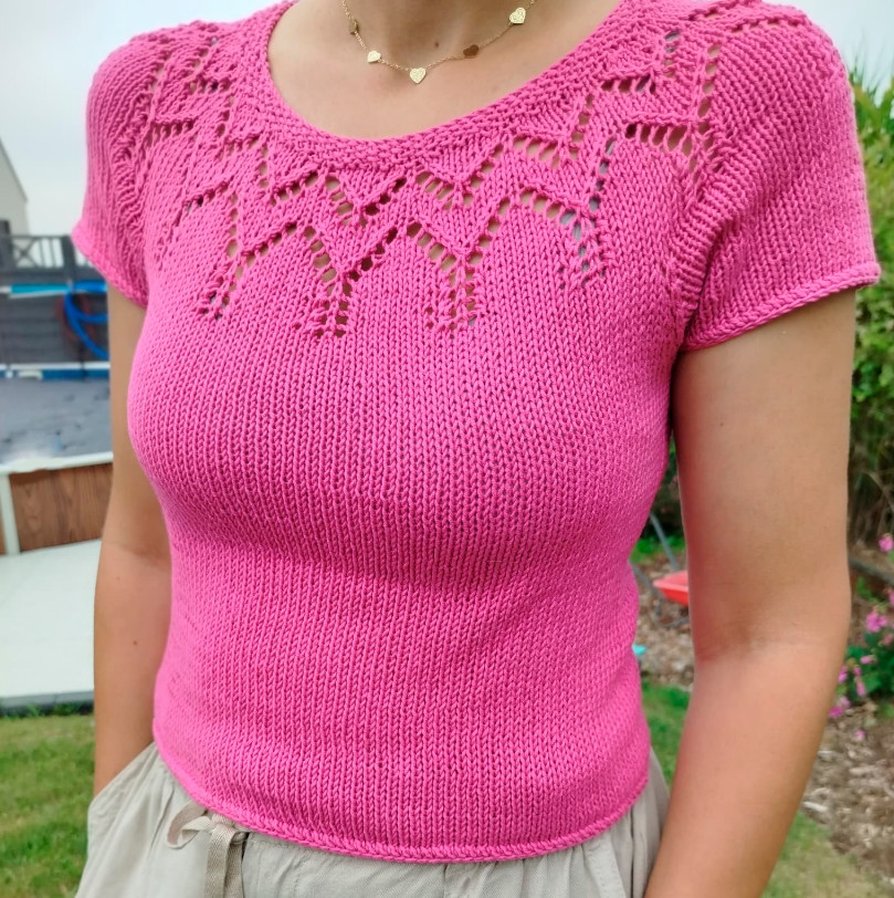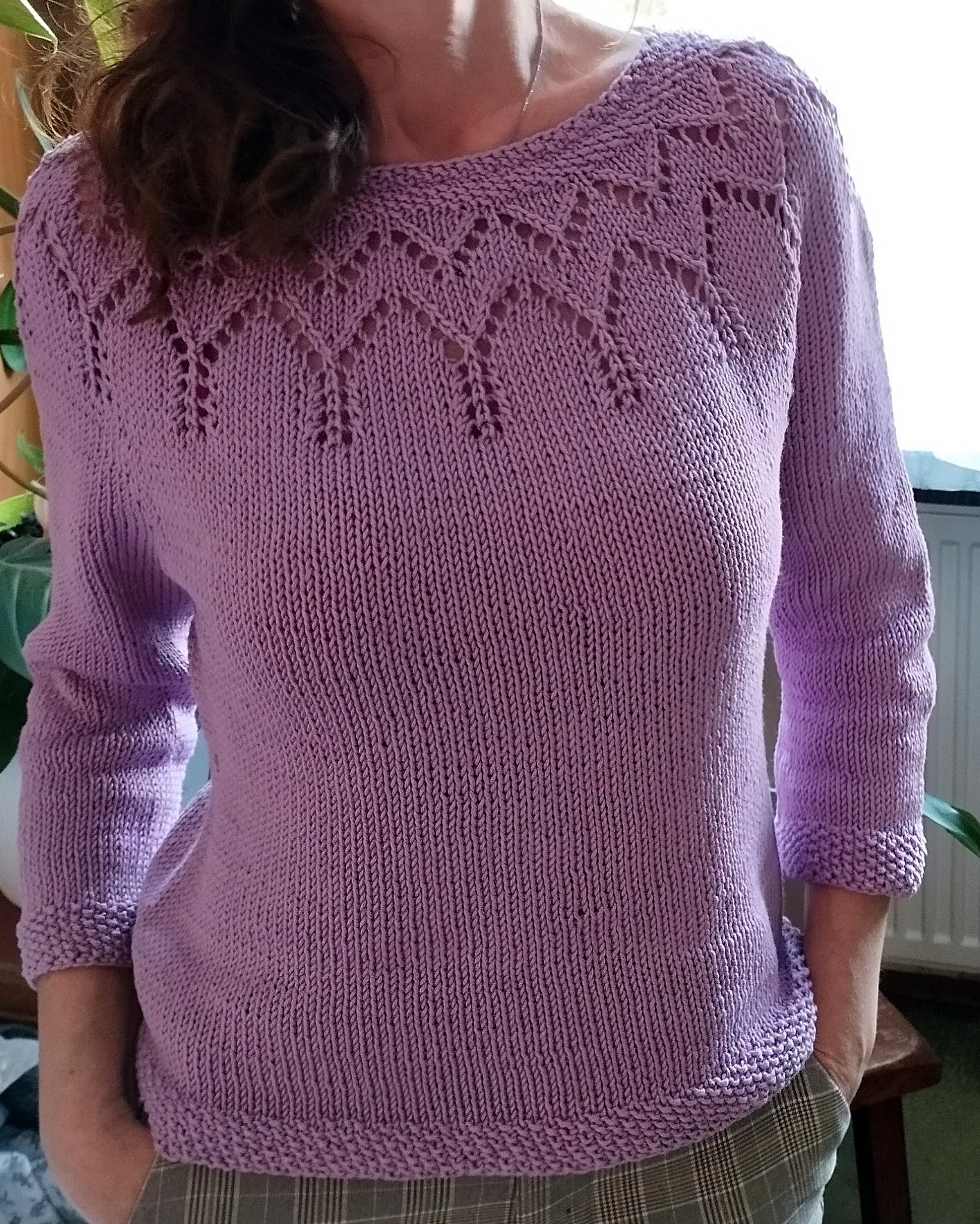 The neck and yoke are worked in the round with circular needle, top down. The yoke is divided for body and sleeves and the body is continued in the round. The sleeve edges are worked in the round with double pointed needles/short circular needle.