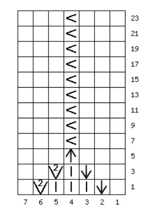 Начиная с 3 и по 23 ряд в начале каждого ряда закрываем по 2 петли.