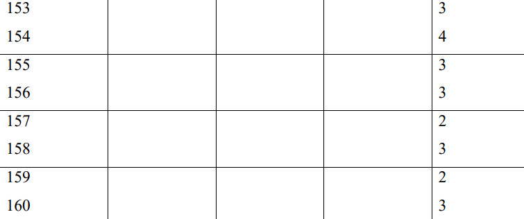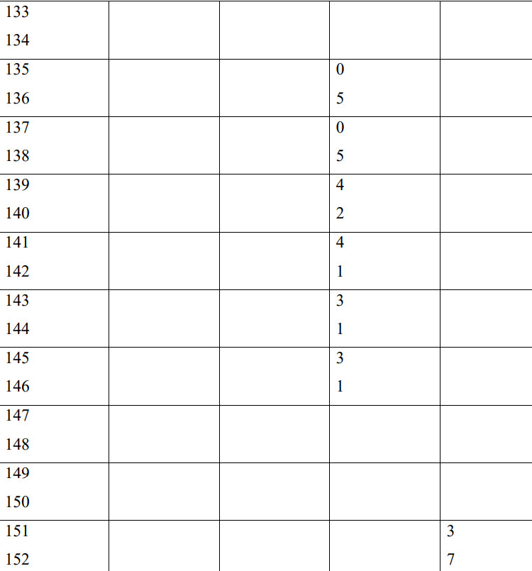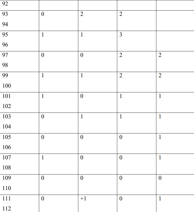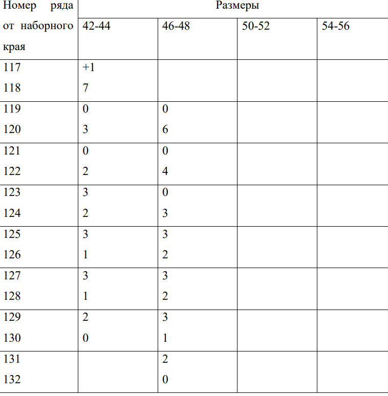 Таблица убавлений проймы. В ячейках указано то количество петель, которое надо убрать в этом ряду.