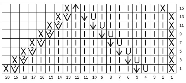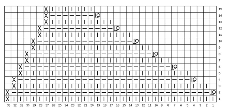 Начиная с 2 и по 15 ряд в начале каждого ряда закрываем по 2 петли.