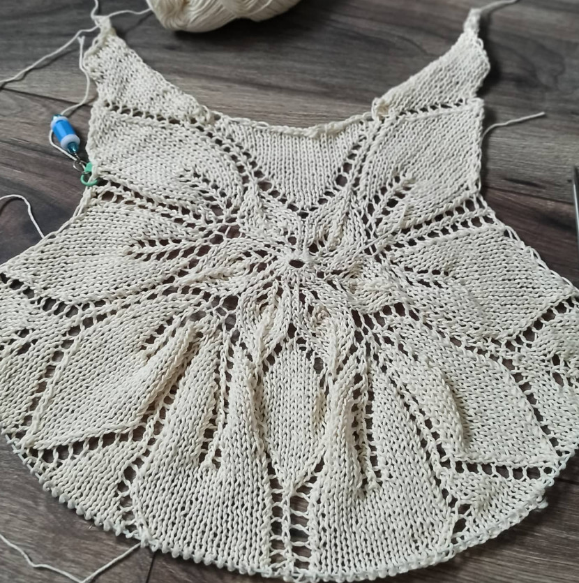 Вяжем перед по кругу. Сначала на чулочных спицах, потом, когда петель станет больше, переходим на спицы