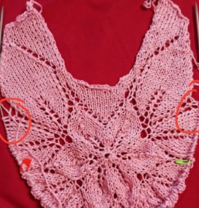 On the left and right sides of the neckline (the first and last stitches of the row) slip off 22 stitches each. On the left side, to the left of the stitches (to the right, respectively, on the right – between the slipped stitches and the remaining stitches) from the long tail, pick up one additional stitch. Next we will work them separately according to the diagrams drawn below.