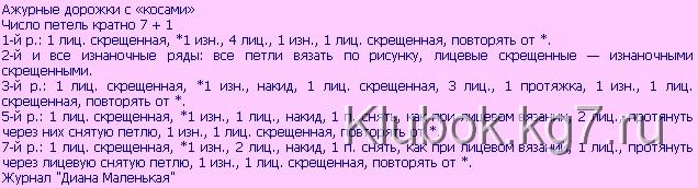 Узор Ажурные дорожки с косами связан спицами №2.5. Пряжу подберите в соответствии с номером спиц. Этот узор хорошо сочетает с чулочной вязкой.