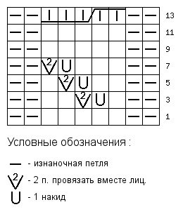 5 - й ряд — * 2 изнаночные, 2 лицевые, накид, 2 вместе лицевой, 1 лицевая, * 2 изнаночные.