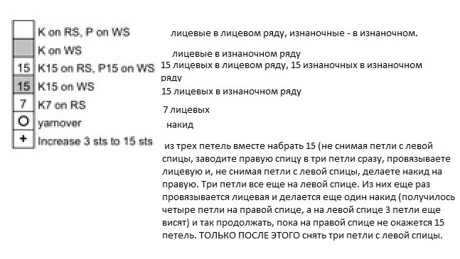 После провязывания четырех рядов платочной вязкой, нужно будет вязать схему А. Считаем петли раппорта схемы А в произвольном порядке: 6 кружочков (накидов) - 0 петель; 6 косых (убавления двух петель с наклоном вправо и влево) - 6х2=12 петель; 1 плюс в клеточке (15 из 3) - 3 петли (хоть на рисунке и одна клеточка, но обозначает она три петли из которых потом будет 15); 3 клеточки с двумя наклонными (одна клетка обозначает пять петель) - 3х5=15 петель. Всего: 6х2+3+3х5=30 петель в раппорте. Раппорта три. 3х30.