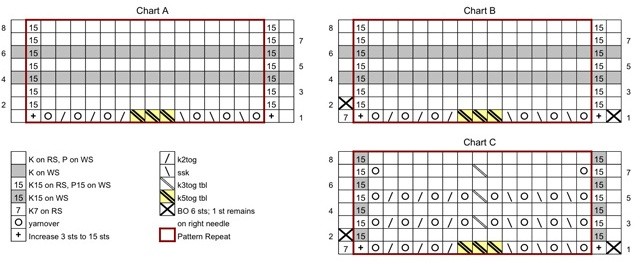 После каждого первого ряда блока (В или С) получается 113 петель за счет прибавления. Это уходит после закрытия 6 петель в начале ряда. Начало работы - набрать 95 петель (для палантина в три раппорта) и провязать 4 ряда лицевыми петлями. После этого приступать к схеме А.