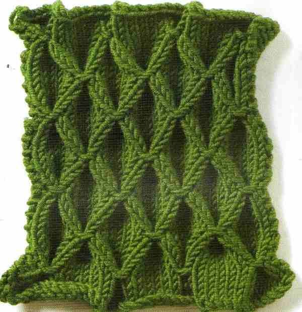 Ряд 15 *Провязать 5Л.снять 1 петлю непровязанной на правую спицу, 5 петель снять непровязанными на дополнительную спицу, следующую петлю снять непровязанной на правую спицу. Нитку положить перед работой (на лицевой стороне влево), перенести обратно 2 петли с правой спицы на левую, нитку переложить вправо и за левую спицу назад, затянуть туго. Провязать лицевой первую петлю с левой спицы, провязать лицевыми все петли с дополнительной спицы, провязать оставшуюся на левой спице 1 петлю лицевой.* и так до конца ряда, начиная со *